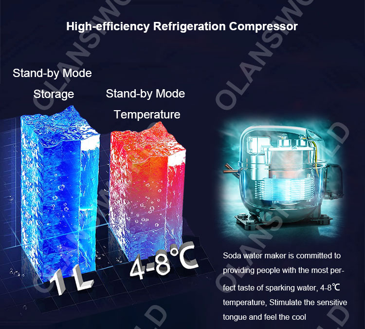 Nano bubble mixing technology, and with 1L stand-by water storage, you can drink the perfect soda at any time without waiting Not only a sparkling water machine, it‘s also a water cooler dispenser. Sparkling water maker with many modes: sparkling water, 5 ℃ ice coffee, ice water, 45 ℃ milk, 85 ℃ coffee, 95 ℃ hot water, room temperature water and more choices . No matter what kind of water your family or customers want, this machine can meet your individual needs.