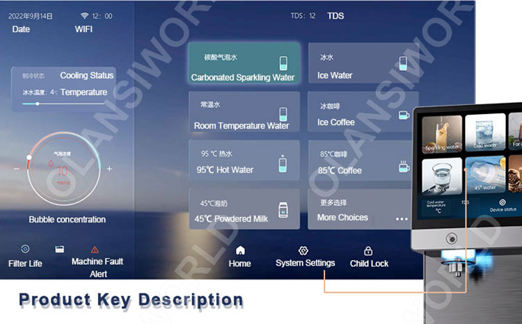 Sparkling water maker with many modes: sparkling water, 5 ℃ ice coffee, ice water, 45 ℃ milk, 85 ℃ coffee, 95 ℃ hot water, room temperature water and more choices . No matter what kind of water your family or customers want, this machine can meet your individual needs.