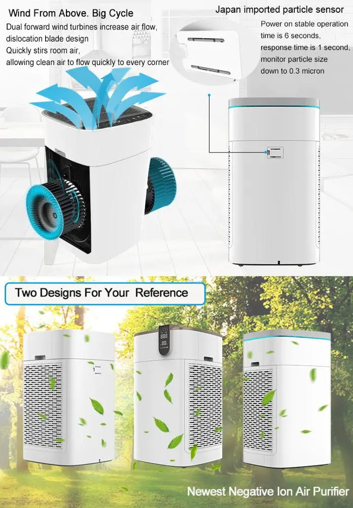 The K15C air purifier features a dual air duct and dual filter design, as well as a HEPA filter. This enables it to achieve an impressive CADR value of 800 m3/h. This makes it suitable for use in various environments, such as homes, offices, and classrooms. It has attracted attention from customers worldwide and is considered a leading product in the market. It combines anion technology with a 2-in-1 filter system. Furthermore, it has a CADR (Clean Air Delivery Rate) of 800 m3/h for PM2.5 and 400 m3/h for formaldehyde. The purifier also features a real-time PM2.5 sensor and a four-color AQI (air quality index) light. There are four speed settings, including Sleep, Auto, and Smoking modes. Other features include a night sensor, timer setting, and child lock, as well as a filter change reminder and Wi-Fi connectivity. An optional 99.9% virus-killing function is also available.